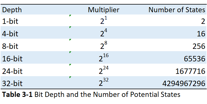 Bit depth is defined as the number of states you have in which to describe the sampled voltage signal. As the number increases, the number of possible states increases exponentially. In fact, the number of possible states increases by 2 to the power of the number of bits. As the number of bits increases, the number of possible states increases exponentially. In fact, the number of possible states increases by 2 to the power of number of bits.